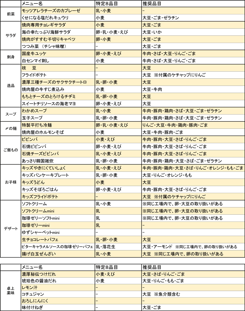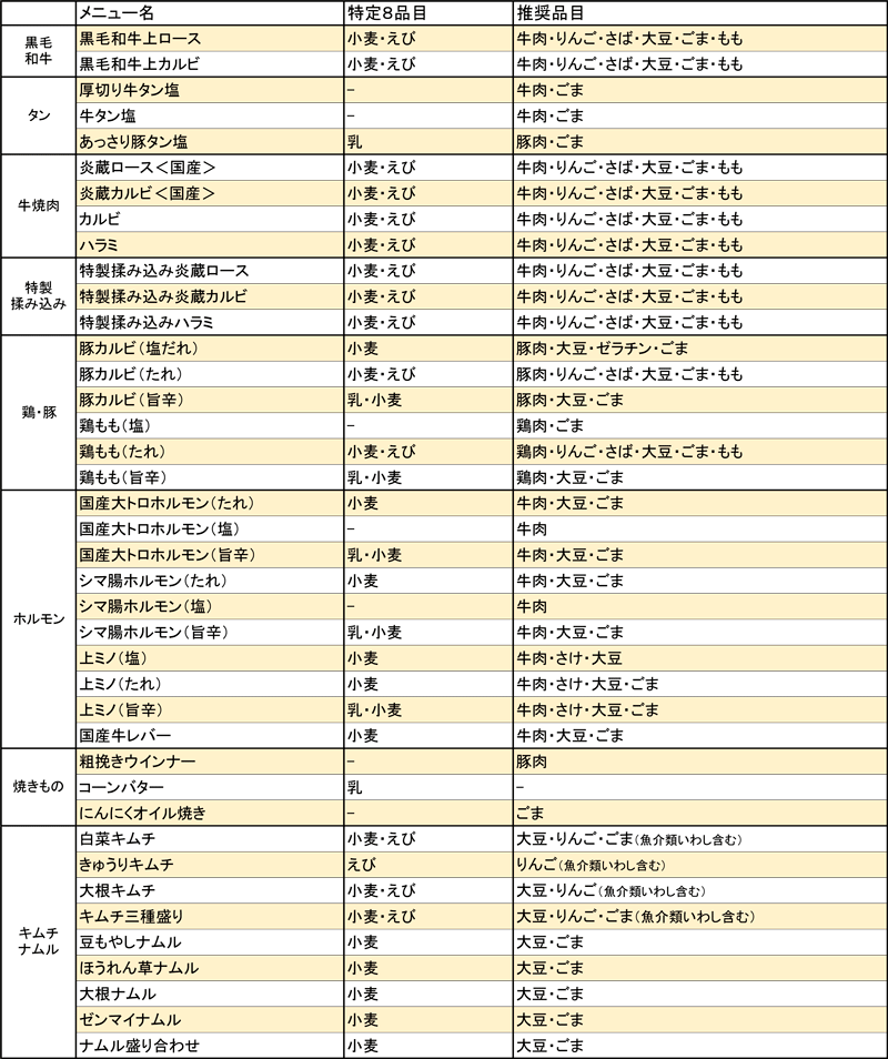 ■ 特定原材料 / 表示義務:8品目えび・かに・小麦・そば・卵・乳・落花生・くるみ■ 特定原材料に準ずるもの / 表示推奨:20品目あわび・いか・いくら・オレンジ・キウイフルーツ・牛肉・ごま・さけ・さば・大豆・鶏肉・バナナ・豚肉・マカダミアナッツ・