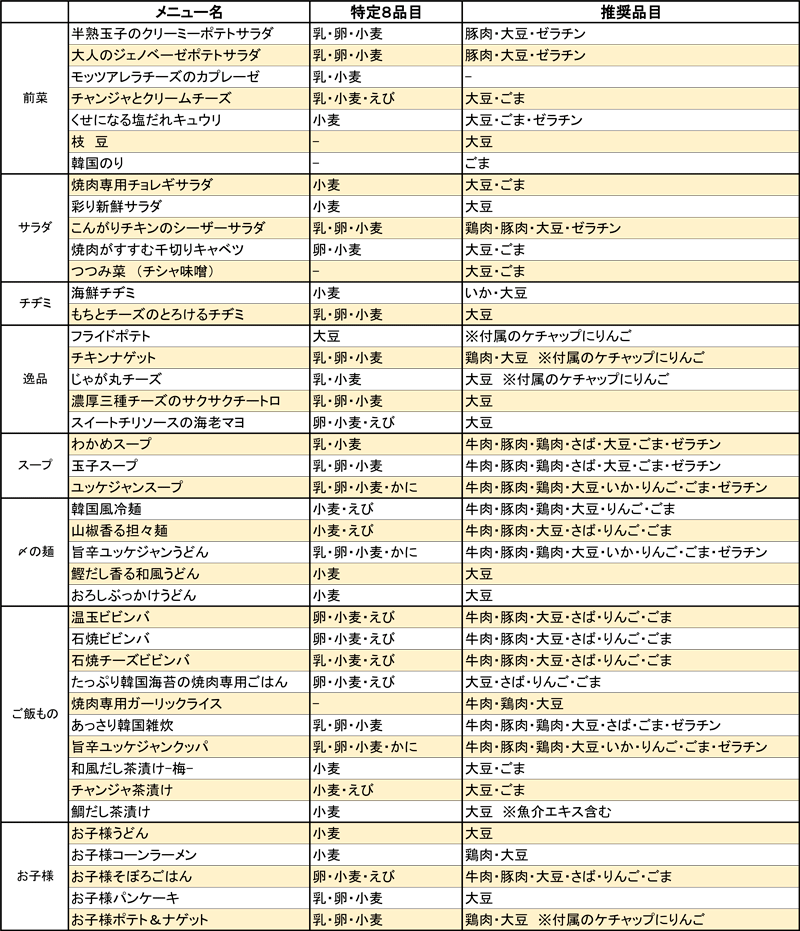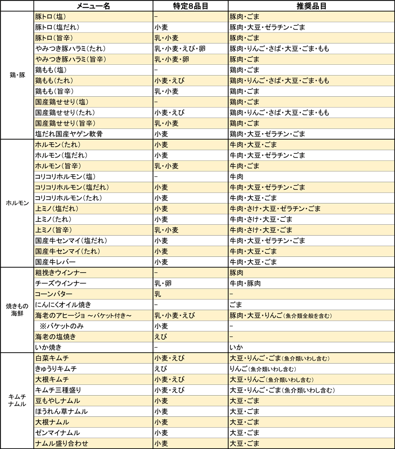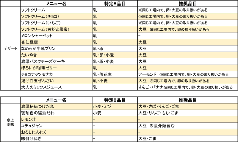 ■ 特定原材料 / 表示義務:8品目えび・かに・小麦・そば・卵・乳・落花生・くるみ■ 特定原材料に準ずるもの / 表示推奨:20品目あわび・いか・いくら・オレンジ・キウイフルーツ・牛肉・ごま・さけ・さば・大豆・鶏肉・バナナ・豚肉・マカダミアナッツ・