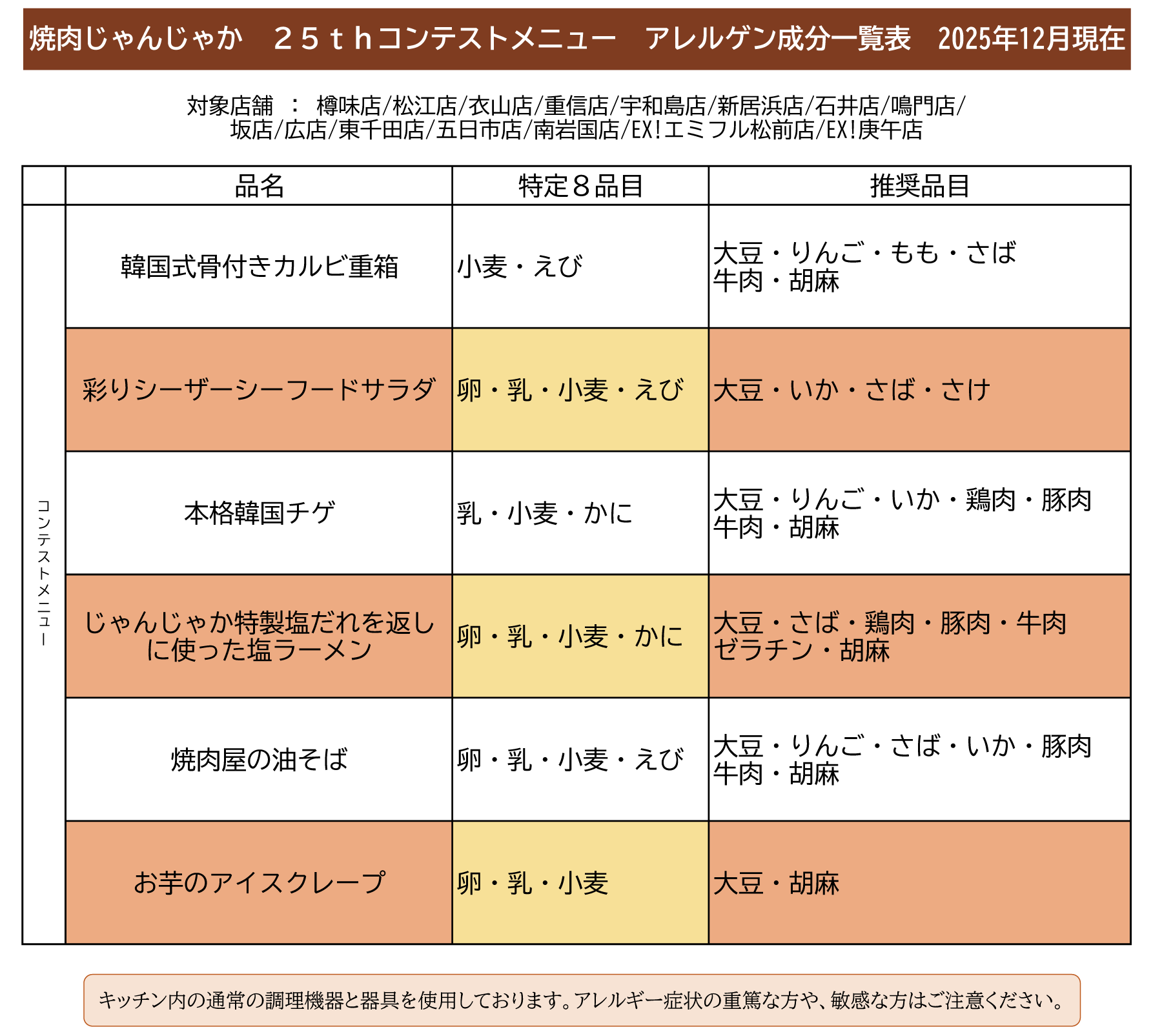 本一覧表のアレルギー情報は以下の対象原材料をもとに調査したものです。