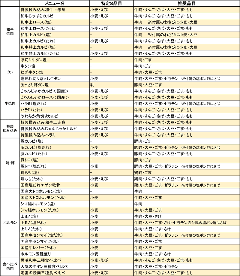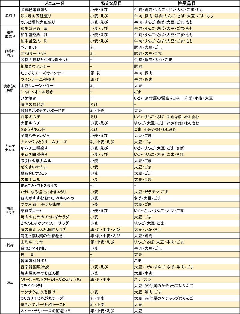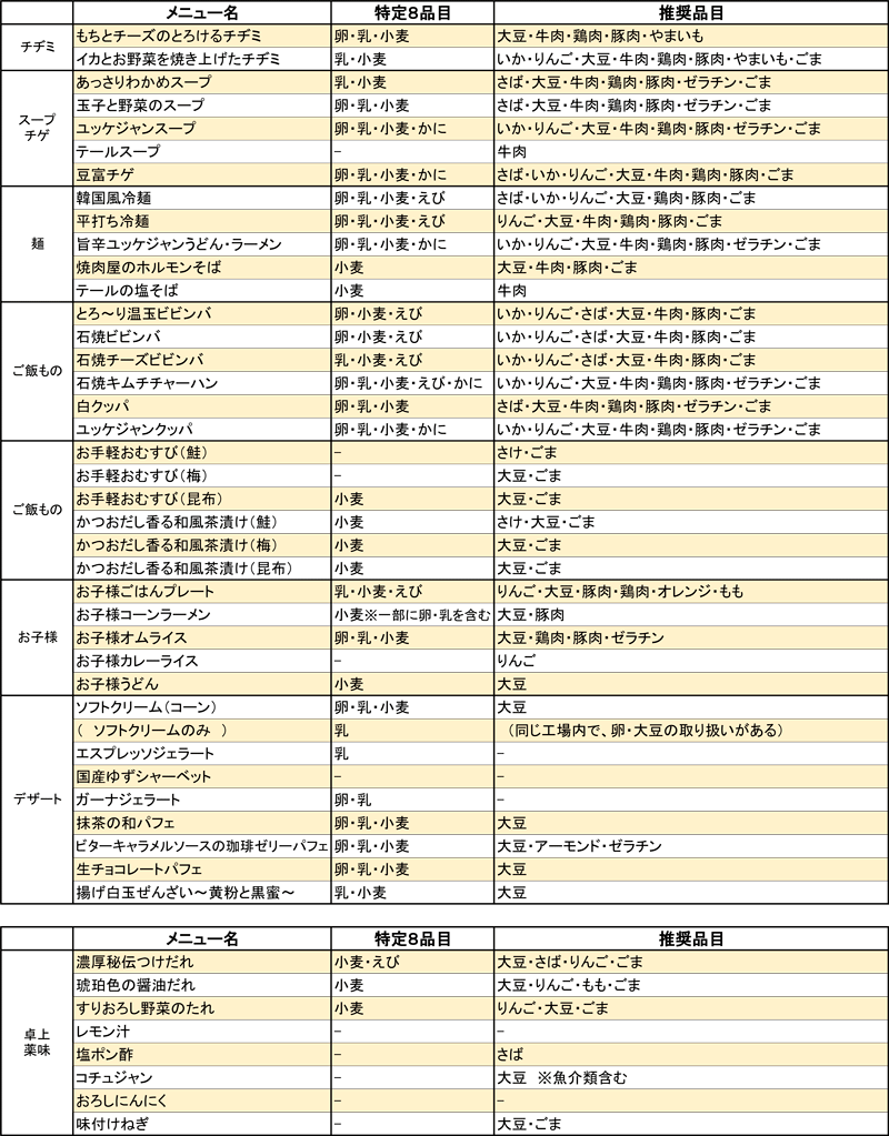 ■ 特定原材料 / 表示義務:8品目えび・かに・小麦・そば・卵・乳・落花生・くるみ■ 特定原材料に準ずるもの / 表示推奨:20品目あわび・いか・いくら・オレンジ・キウイフルーツ・牛肉・ごま・さけ・さば・大豆・鶏肉・バナナ・豚肉・マカダミアナッツ・