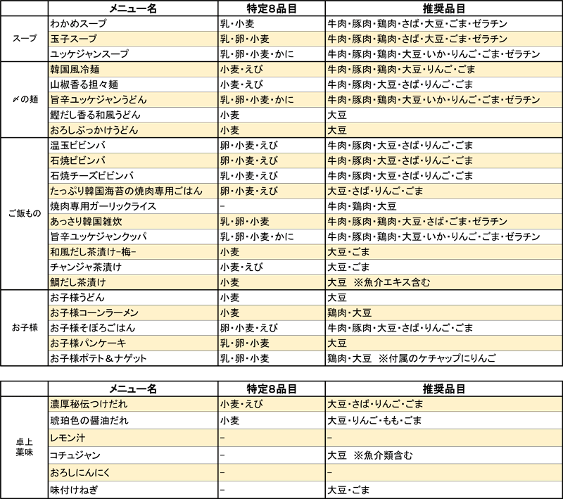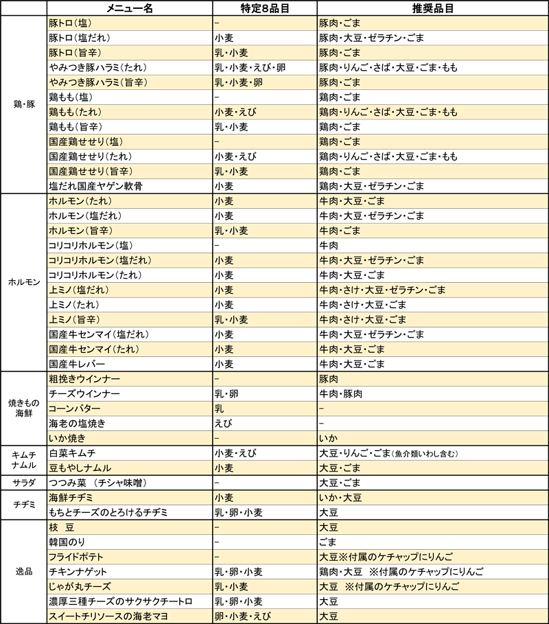 ■ 特定原材料 / 表示義務:8品目えび・かに・小麦・そば・卵・乳・落花生・くるみ■ 特定原材料に準ずるもの / 表示推奨:20品目あわび・いか・いくら・オレンジ・キウイフルーツ・牛肉・ごま・さけ・さば・大豆・鶏肉・バナナ・豚肉・マカダミアナッツ・