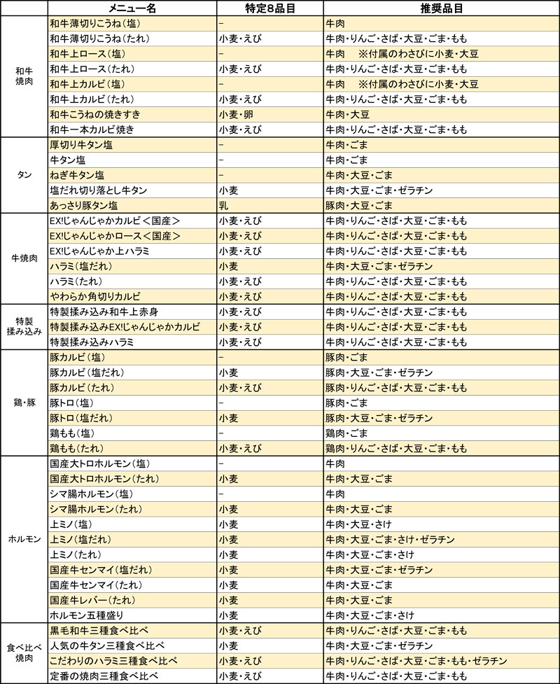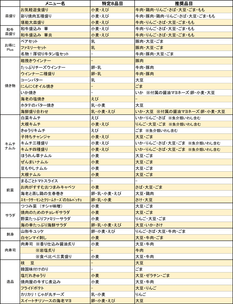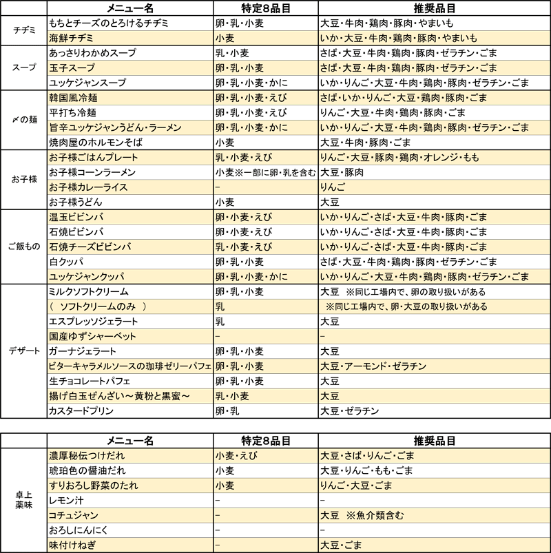 ■ 特定原材料 / 表示義務:8品目えび・かに・小麦・そば・卵・乳・落花生・くるみ■ 特定原材料に準ずるもの / 表示推奨:20品目あわび・いか・いくら・オレンジ・キウイフルーツ・牛肉・ごま・さけ・さば・大豆・鶏肉・バナナ・豚肉・マカダミアナッツ・