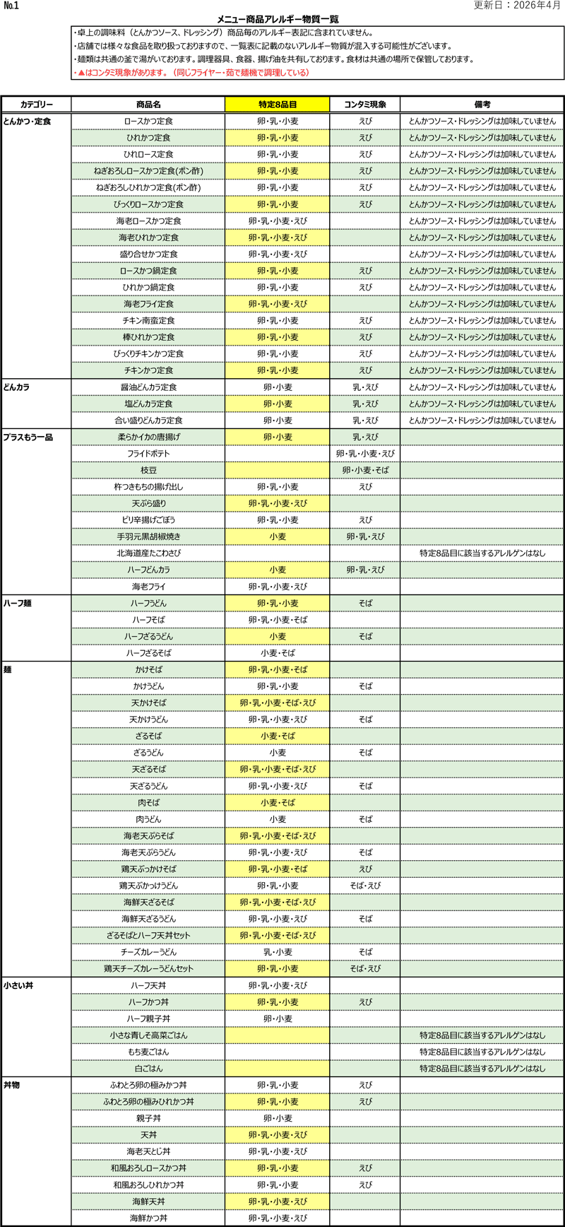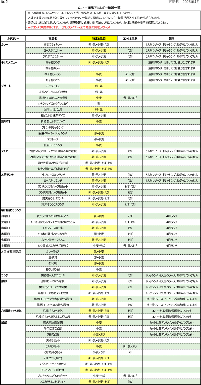 和食 どんとアレルゲン成分一覧表