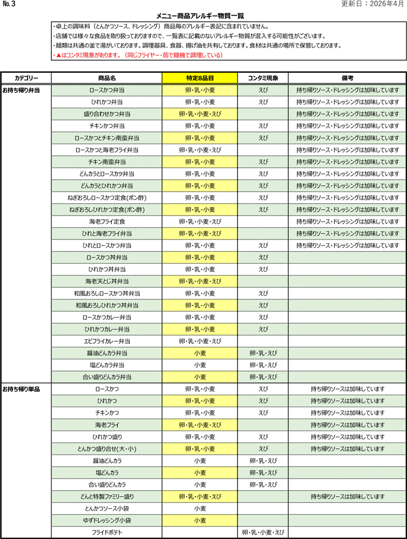 和食 どんと アレルゲン成分一覧表