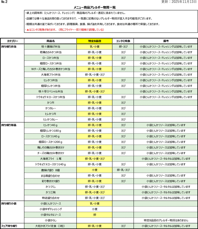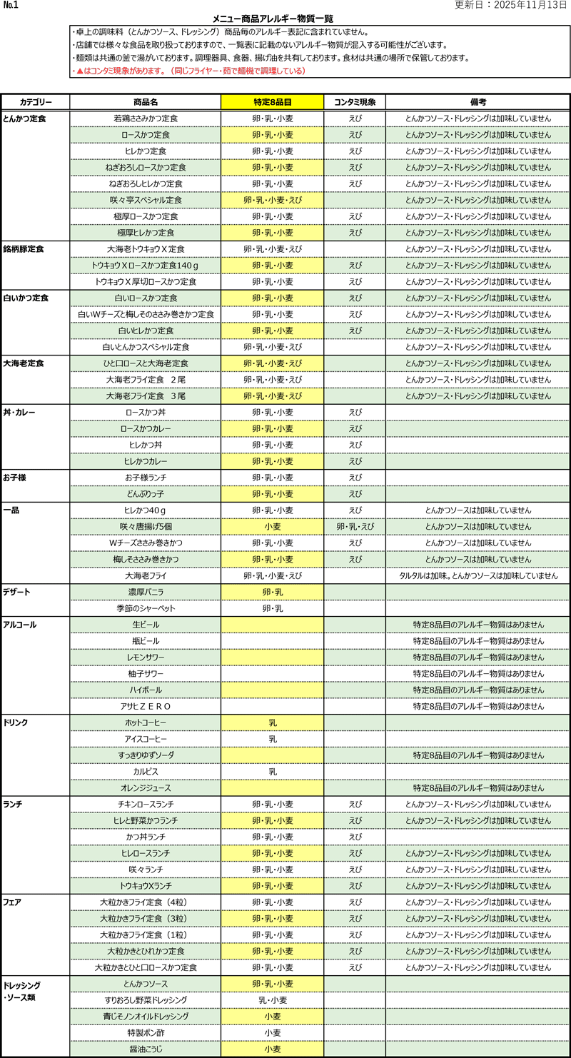 とんかつ専門店咲々亭 アレルゲン成分一覧表