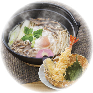 甘めのおだしで煮込んだ鍋焼きうどんに、海老や野菜の天ぷらを添えました。