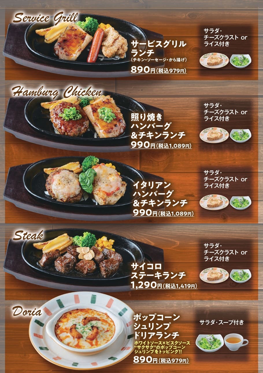 👑おすすめポイントはボリュームと豊富なバリエーション!グリル・ハンバーグ・ドリアと、気分に合わせて選べるランチが勢ぞろい。