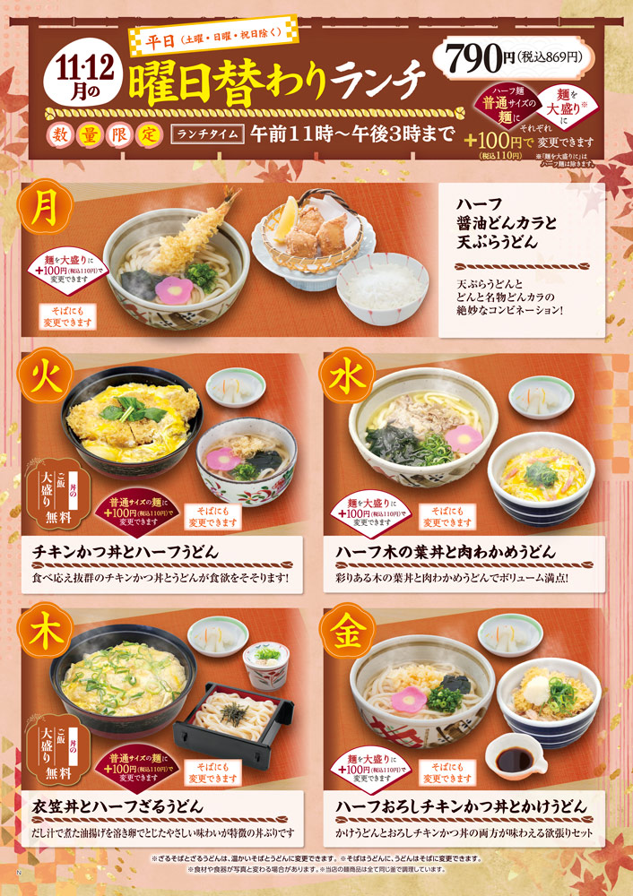 週のはじまりから週末まで、おいしく・お得に。忙しいビジネスマンやOLの方、一人でのランチにもぴったり。