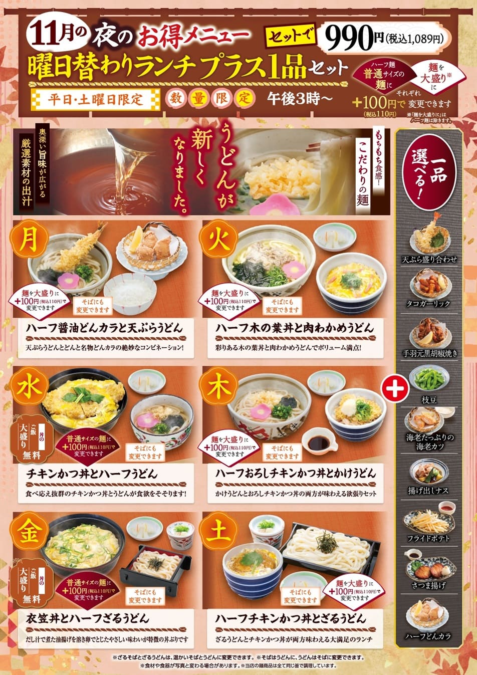 11/1(土)からスタートするのは、夜のお得メニュー「曜日替わりランチプラス1品セット」!