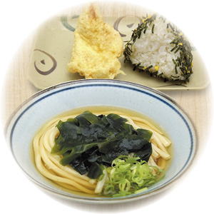 【豚わかめぶっかけ + ちくわ磯辺天 + ごま塩むすび】