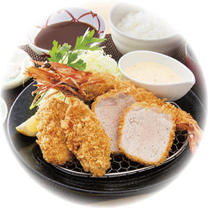 有頭海老フライ、かきフライ、小判ロースかつ …3つの自慢の味を一度に楽しめる贅沢な定食。