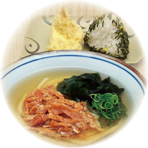 甘く煮込んだ刻みきつね揚げと、磯の香り豊かなわかめをトッピングした温かいうどん。