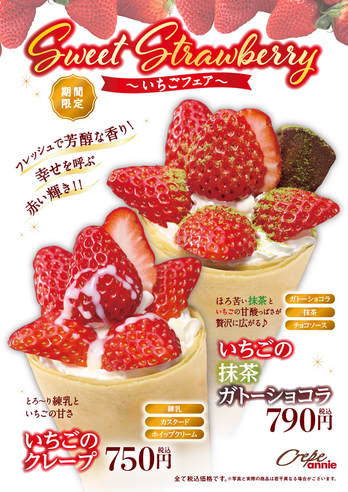 クレープ・アイス「アニー」では、 3/11(水)から、期間限定『いちごフェア』がスタートします。